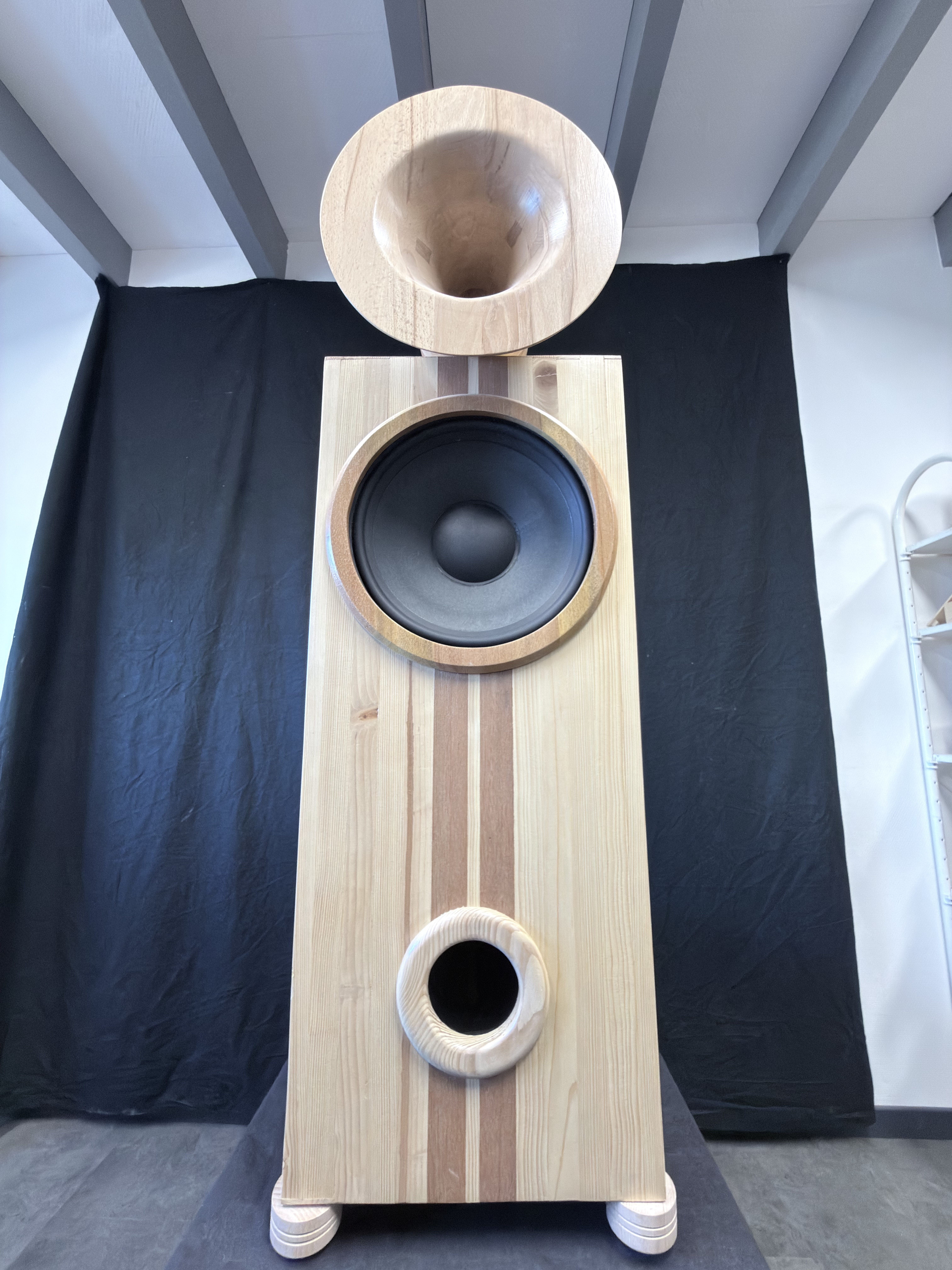 - 25cm Membrane Papier monté dans une enceinte antirésonnante composée de 17 couches de bois de différentes densités
