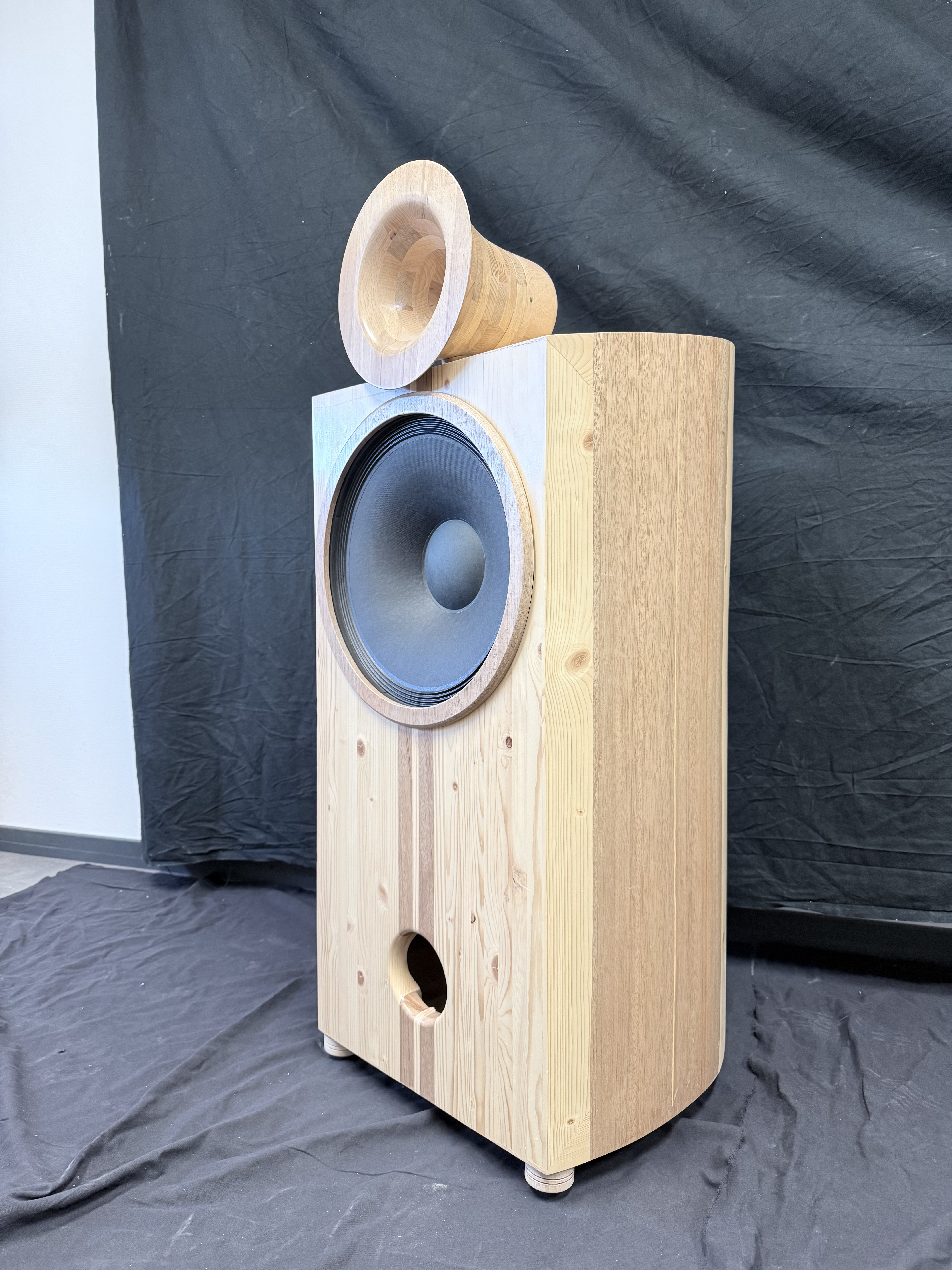 - 38cm Membrane Papier monté dans une enceinte antirésonnante composée de 23 couches de bois de différentes densités